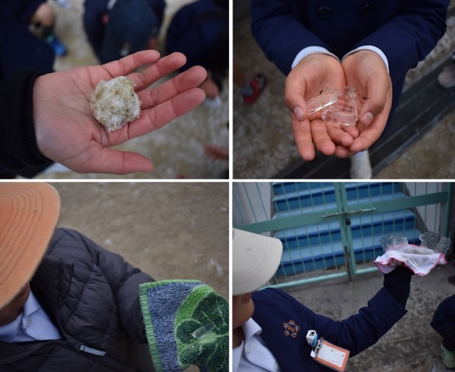うっすらと雪化粧をした運動場に、子どもたちは大喜び。小さな雪玉をつくったり、氷を見つけて大事そうにハンカチでくるんだり・・・。雪で手がかじかむ体験が初めての子も。