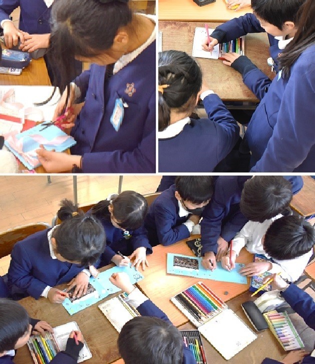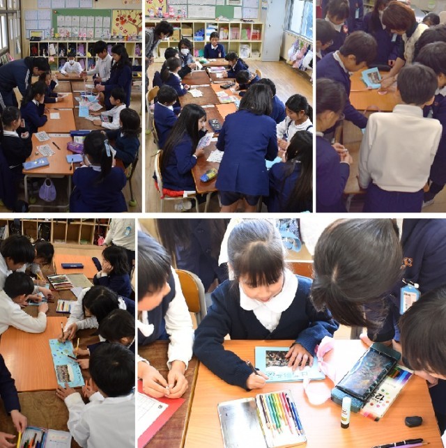 たてわり班の1年生から5年生が集まって、1年間お世話になった6年生にメッセージカードを作りました。