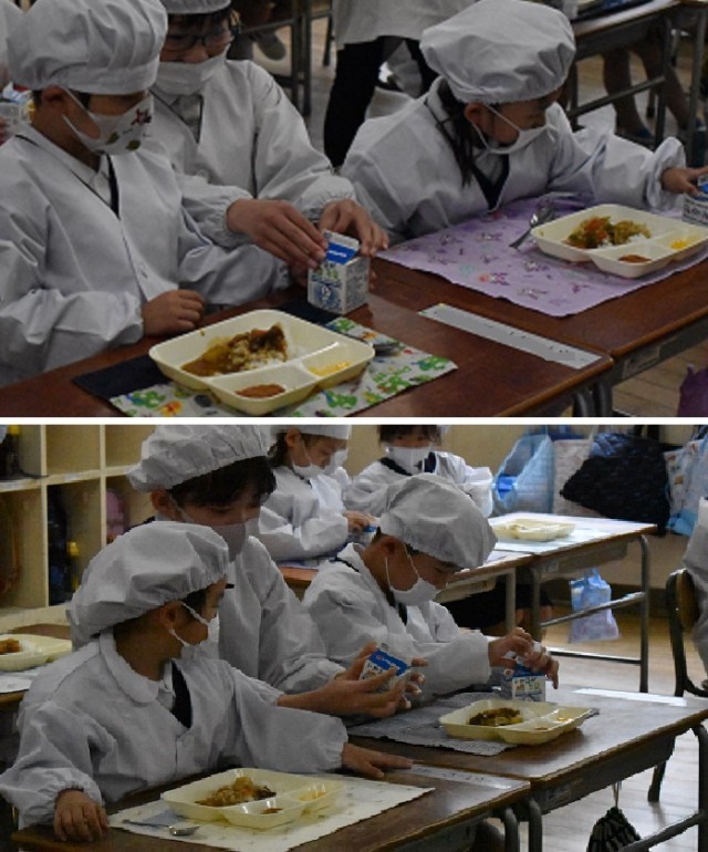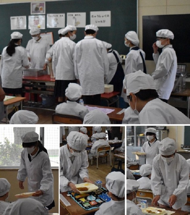 6年生が、食器や食缶を運んだり、おかずを配膳したり、牛乳パックを開けるお手伝いをしたりと、とてもきめこまやかに準備を手伝っていました。