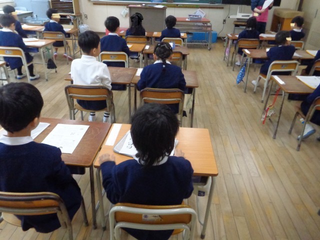 1年生と2年生の朝の会の様子です。先生の話を聞いて、お家の方に渡すプリントを先生から受け取り、後ろのお友達に渡しています。話を聞く態度もできているかな。