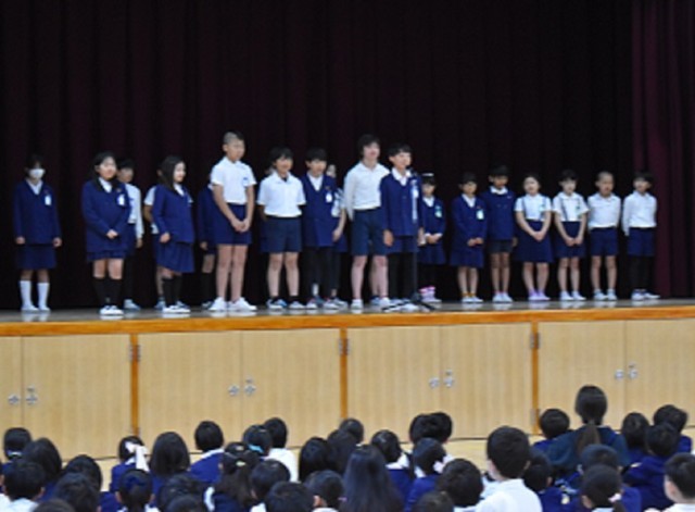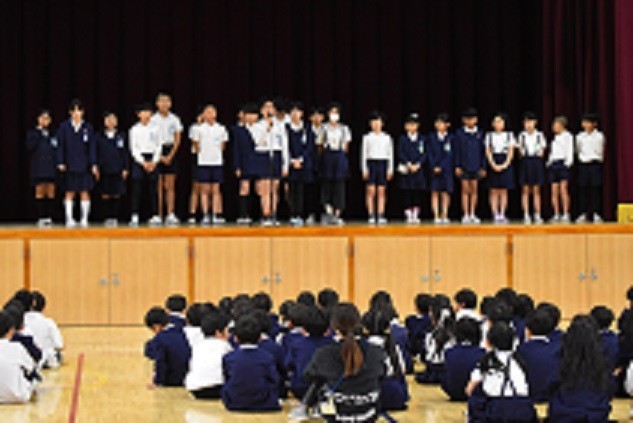 今朝の児童集会は、講堂での「児童会開き」でした。計画委員会と各委員会の委員長が、全校児童へ向け自己紹介をしました。
