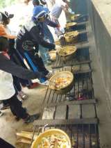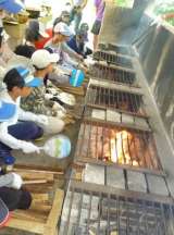「火起こし」係は、まきの組み方を教わり、いざ、点火。 反対のコーナーでは、「材料...
