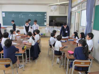 宮原小学校では、異なる学年の子ども達が交流する「たてわり班活動」もしています。1年生から6年生までの児童を学年ごとに1人か2人ずつ集めて、8〜9人のグループをつくります。異学年で集会のゲームやクイズを楽しんだり、全校集会の活動をしたりして、高学年のリーダーシップや、下の子ども達のフォロワーシップを育みます。