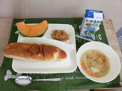 今日のメニューはカレードリア、スープ、クインシーメロン、おさつパン、牛乳です。