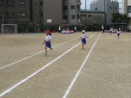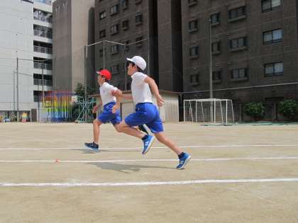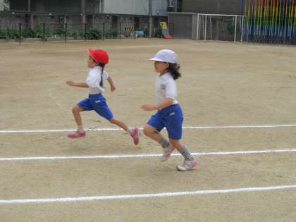 スポーツテストでは、50m走の記録会が始まりました。「よぉい、どん!」と旗が振られると、ゴールめがけて走ります。日本記録ではなく、「自分記録」の更新に子ども達の一年間の成長が見られます。