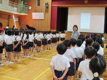 創立記念をお祝いする集会の最後には、学校のお誕生日をお祝いして、みんなで明るく元気に校歌を歌いました。
