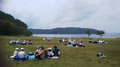 班の友だちとおしゃべりを楽しみながら、午後からの活動エネルギーをたくわえました。風が頬をなでます。湖面は穏やかです。さあ、今から、湖上活動の用意をします。