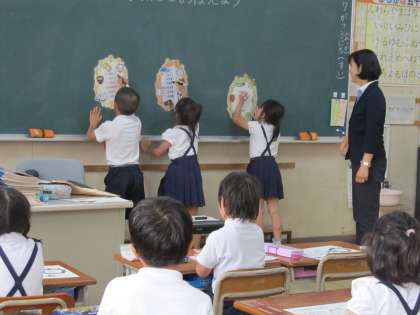 そうです、3つのグループは「栄養の3要素」で分けられていたのです。1年生の子ども達は食べ物の名前を言いながら、赤グループ…「体をつくる」、「黄グループ…熱や力のもとになる」、「緑グループ…体の調子を整える」といった、栄養のグループについて学習することができました。