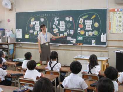 今日から淀川区の栄養士さんが来てくださって、子ども達に食育の授業をしてくださいます。初日は1年生で、「たべものの なまえを おぼえよう」という学習でした。
