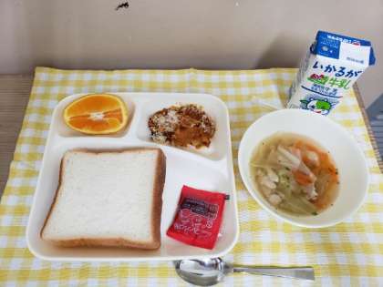 今日のメニューはかぼちゃのミートグラタン、スープ、オレンジ、食パン、いちごジャム、牛乳です。今日のかぼちゃのミートグラタンは旬のかぼちゃの甘みと牛ひき肉、豚ひき肉のうま味がとてもよく合うケチャップ味のグラタンです。給食の時間は友だちや先生と話ながら食事をするとまた楽しいです。みんながわかる話、うれしい話、楽しい話、聞いていて、さらにおいしくなるよう、食事の場にふさわしい話がたくさん交わされています。「いただきます!」「ごちそうさま!」も、それぞれの教室に響きます。