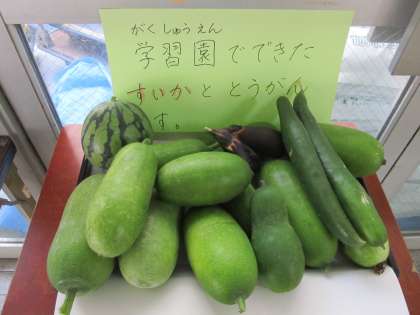 管理作業員さんが学習園でできた野菜を収穫して、職員室に届けてくださいました。大きなお盆にのせて学校の玄関に展示しておくと、休み時間に前を通った子ども達が気づいて足を止めます。冬瓜、スイカ、なす、きゅうり。野菜を手に持って重さを確かめたり、皮をなでてツルツルやザラザラとした皮の手触りの違いを比べたりしていました。