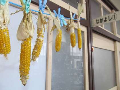 なかよし教室の前に並んでぶら下がっているのは、とうもろこしの実です。これはポップコーンをつくるときに使う「爆裂種」という種類なので、ふだん食べてるものとは異なり小さめで、粒が硬くなっています。