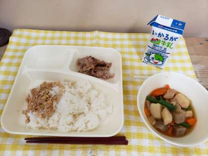 今日の献立は、豚肉のねぎじょうゆ焼き、ふきよせ煮、ツナ大豆そぼろ、ごはん、牛乳です。