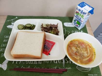 今日の献立は、牛肉のカレー風味焼き、トマトのスープスパゲッティ、きゅうりのピクルス、食パン、イチゴジャム、牛乳です。
