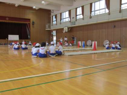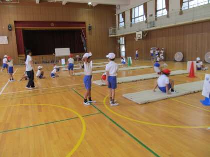 今日の2限目、教育実習のまとめとして体育の「マットあそび」の実習授業を行いました。まずはマットの上で「クマさん歩き」や「エンピツ転がり」など、いろいろな動きをして遊びました。次にグループのお友達と相談して技を組み合わせて、発表会の練習をしました。クモやダンゴムシ、小鳥のような動きをマネして、可愛らしい動きを表現していました。子ども達は実習生の先生のお話をよく聞いて、グループのお友達と仲良くマット遊びを楽しみました。