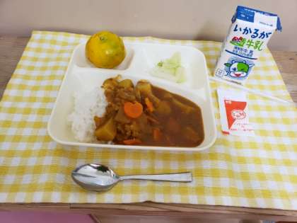 今日の献立は、ポークカレーライス【米粉】、キャベツのサラダ【ノンエッグドレッシング】、みかん、牛乳です。