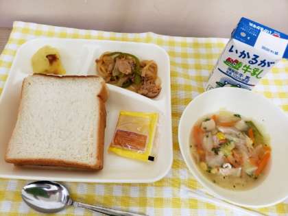 今日の献立は 豚肉と野菜のケチャップソテー、スープ、スイートポテト、食パン、アプリコットジャム、牛乳です。
