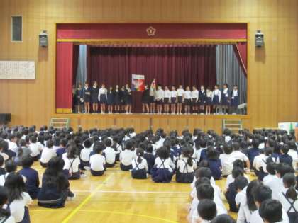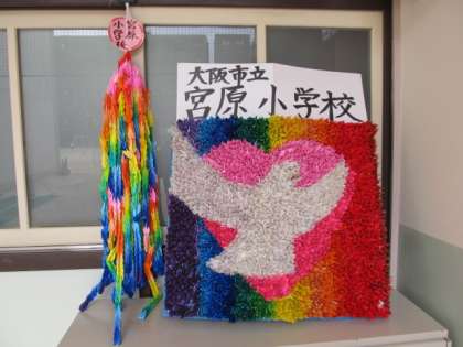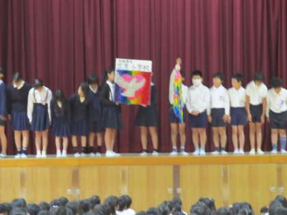 先日のたてわり班の時間に1年生から6年生のみんなで折った小さな折り鶴を、6年生がきれいな飾りに仕上げてくれました。舞台の上に上がった代表児童がその飾りをみんなに披露すると、子ども達から「すごい!」と驚きの声があがりました。