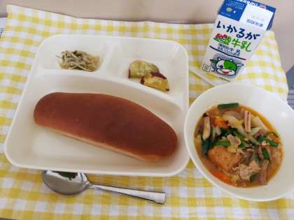 今日の献立は、豚肉といかの中華煮、焼きさつまいもの甘みつかけ、もやしとピーマンのいためもの、黒糖パン、牛乳です。