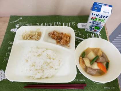 今日の献立は、 あげどりのねぎだれかけ、含め煮、もやしのゆずの香あえ、ごはん、牛乳です。