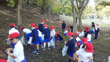 公園の中に入ると、「先生!見て。」「どんぐりいっぱい〜。こっちにもある!!」と夢中で探していました。どの子も楽しそうに活動し、ドングリやきれいな色の落ち葉など、たくさんの秋を見つけ集めることができました。