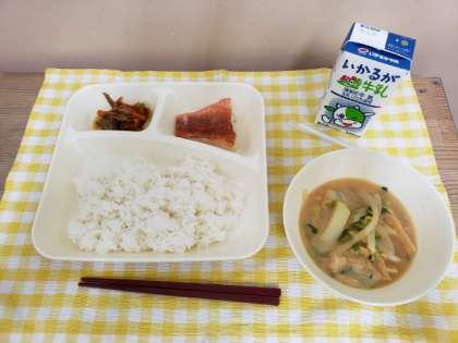 今日の献立は、あかうおのしょうゆだれかけ、みそ汁、きんぴらごぼう、ごはん、牛乳です。