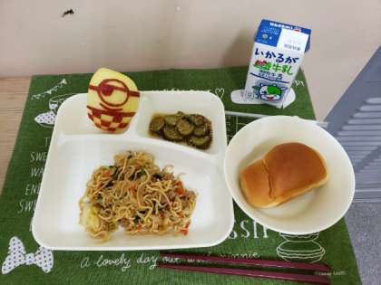 今日の献立は、オイスターソース焼きそば、きゅうりの中華あえ、りんご、黒糖パン(1/2)、牛乳です。