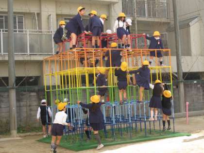 火曜日の1時間目が終わると、運動場に飛び出してきた1年生の子ども達が、職員室の前のジャングルジムにどんどん上っていきました。ジャングルジムが大盛況です。