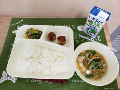 今日の献立は、あげシューマイ、とうふのスープ、ツナとチンゲンサイのいためもの、ごはん、牛乳です。