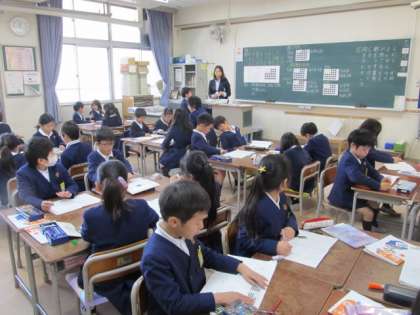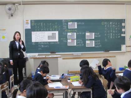 2年2組で、算数の指導法についての研修授業を行いました。これまで学習してきた掛け算の考え方を使い、たくさん並んだチョコレートを工夫して数えます。