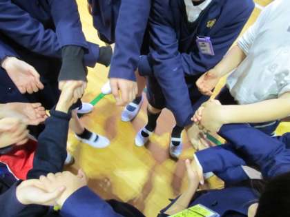 班のメンバーでバラバラにつないだ手をはなさずに、乗り越えたり、くぐったり、ひっくり返ったりしてほどいていきます。「ああでもない、こうでもない」と頭をひねって、みんなで相談してゲームを楽しんでいました。
