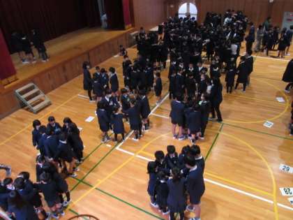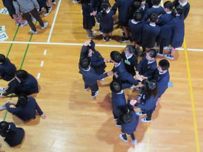 新学期になって初めての児童集会があり、たてわり班で「にんげん知恵の輪」をしました。集会委員会のお兄さんとお姉さんが、ステージの上で見本をみせてくれてます。ルールがわかったところで、班で輪になり手をつないでゲーム・スタートです。