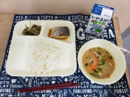 今日の献立は、さごしのしょうゆだれかけ、みそ汁、みずなの煮びたし、ごはん、牛乳です。