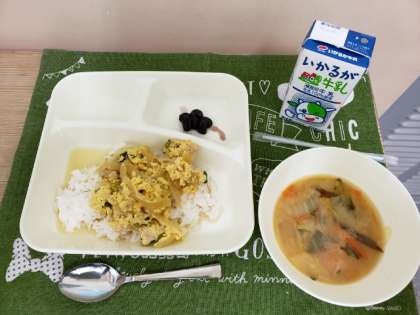 今日の献立は、親子丼、みそ汁、黒豆の煮もの、牛乳です。