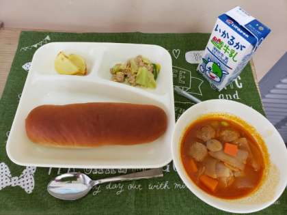 今日の献立は、ミートボールのケチャップ煮、ツナと野菜のソテー、焼きじゃが、黒糖パン、牛乳です。