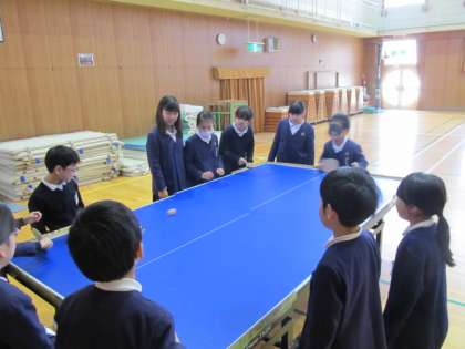 講堂では視覚に障がいのある方が楽しむ卓球を、子ども達も体験しました。卓球台の中央にネットがなく、ボールをふるとコロコロコロと軽やかな音がします。ラケットにはラバー(ゴムの板)が貼っておらず、板でボールをはじいて転がすゲームです。子ども達は交代でゲームをしましたが、目隠しをしてボールの方向を音で聞き分けるのは難しかったです。