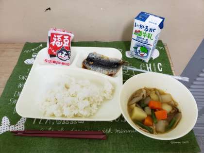 給食では、節分の行事献立として「いわしのしょうがじょうゆかけ」と「いり大豆」が出ます。