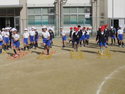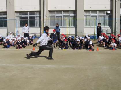 最後にミニ・ハードルを使って、ダッシュを何度も繰り返しました。2年生の子ども達の走る勢いも、どんどん速くなりました。走り方教室の終わりに講師の先生が、「速く走るために大切なのは?」と子ども達に尋ねると、2年生に子ども達は大きな声で「姿勢!」と答えていました。