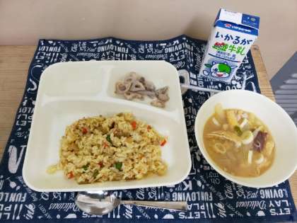 今日の献立は、鶏ごぼうご飯、みそ汁、焼きれんこん、牛乳です。