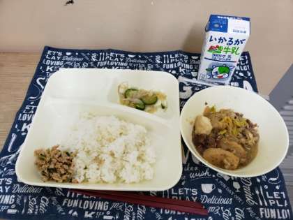 今日の献立は、すき焼き煮、もやしときゅうりのしょうがづけ、ツナっ葉いため、ごはん、牛乳です。