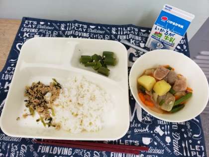 今日の献立は 豚肉とじゃがいもの煮もの、オクラの梅風味、ツナっ葉いため、ごはん、牛乳です。