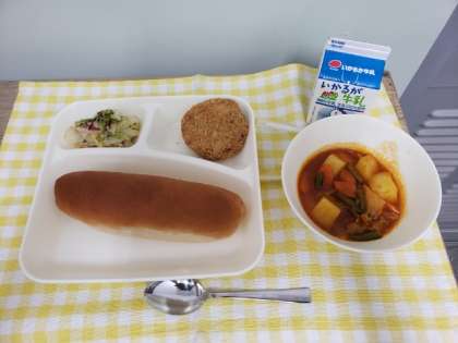 今日の献立は チキンレバーカツ、ケチャップ煮、たことキャベツのバジルソテー、黒糖パン、牛乳です。