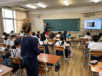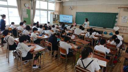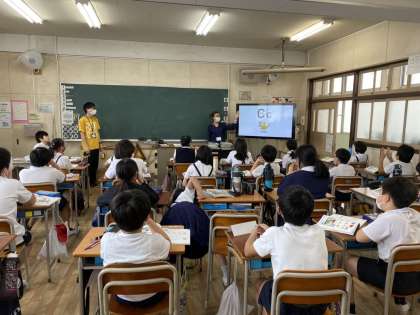 5年生の外国語の授業の様子です。今日は「What color do you like?」など、好きな〜を尋ねる英語を覚えて、友達と交流しました。C-NETの先生も交えて、とても楽しく活動することができました。