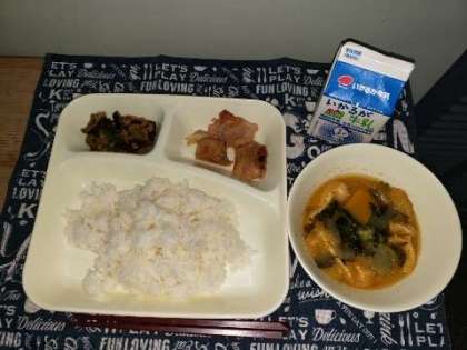 今日の献立は、鶏肉のてり焼き、みそ汁、なすのそぼろいため、ごはん、牛乳です。