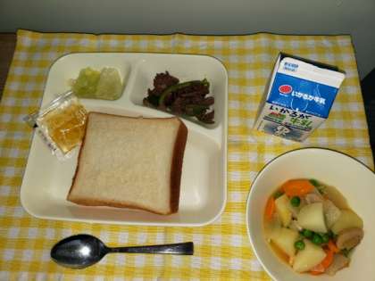 今日の献立は、牛肉の香味焼き、スープ煮、サワーキャベツ、食パン、マーマレード、牛乳です。