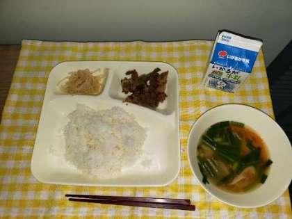 今日の献立は、プルコギ、トック、もやしの甘酢あえ、ごはん、牛乳です。