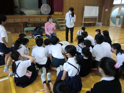 10月5日(月)四年生は、盲導犬のいるくらしについて学びました。盲導犬と一緒に視覚障がいのある方が来てくださり、お話を聞きました。盲導犬の仕事、普段どのように生活しているかなどのDVDを見たり、視覚障がいのある方がされる卓球を体験したりしました。最後には盲導犬に触らせていただきました。実際に盲導犬や視覚障がいのある方と関わり、良い経験になったと思います。