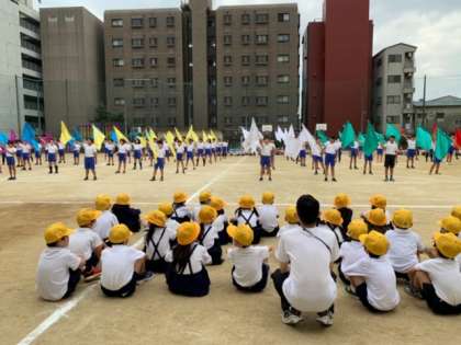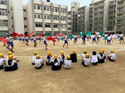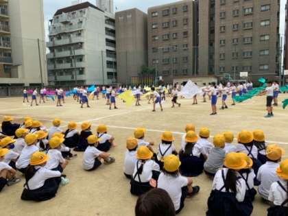 運動会で見せることができなかった6年生の団体演技「虹旗の舞」を1年生と3年生にお披露目しました。