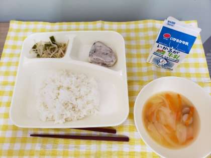 今日の献立は、かつおのマリネ焼き(ノンエッグドレッシング)、ウインナーと野菜のスープ、もやしとピーマンのソテー、ごはん、牛乳です。