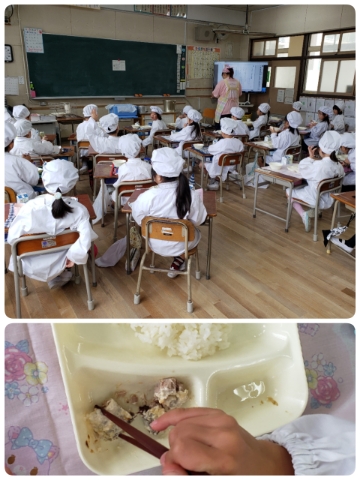 下の写真は、1年生の給食の時間の様子です。魚の骨に気を付けて、上手に「かつおのマリネ焼き」を食べていました。